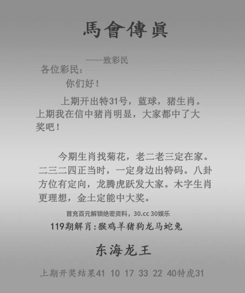 119期马会传真: 今期生肖找菊花,老二老三定在家 二三二四正当时,一定身边出特码 八卦方位有定向,龙腾虎跃发大家 木字生肖更理想,金土定能中大奖 东海龙王 解:今期老二老三定在家,解家禽生肖牛猪鸡羊狗马,金土定能中大奖,解金肖猴鸡 特围生肖:龙虎兔鸡蛇羊鼠猪牛 主特六肖:龙虎兔鸡蛇羊 |